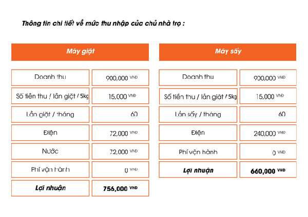 Dựa trên một khu trọ có quy mô nhỏ khoảng 20 phòng, sẽ lắp khoảng 6 máy gồm 3 máy giặt và 3 máy sấy. Mỗi tháng lãi trung bình khoảng 800.000 đồng/máy, 6 máy sẽ có thu nhập khoảng 4.800.000 đồng/tháng, ước tính mức giặt khoảng 90 lần sử dụng trong một tháng (tương đương chỉ 3 lượt/ngày, số lượt sử dụng càng nhiều thu nhập càng cao)