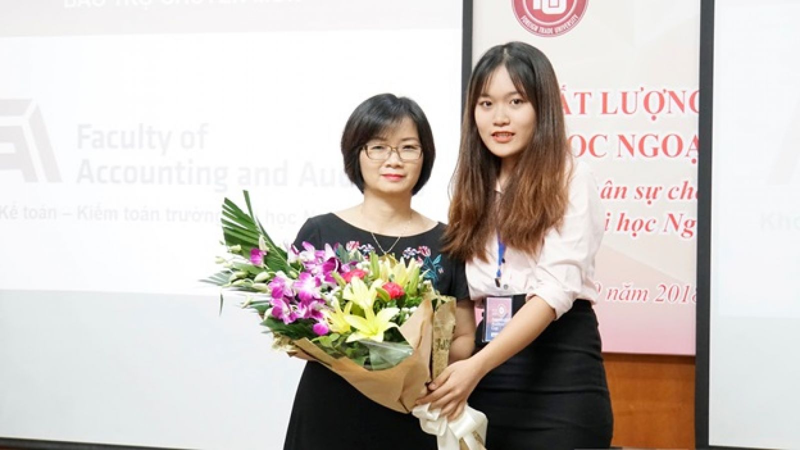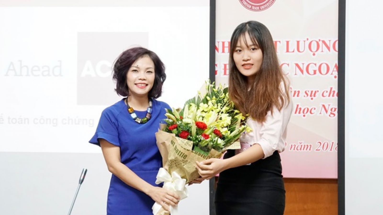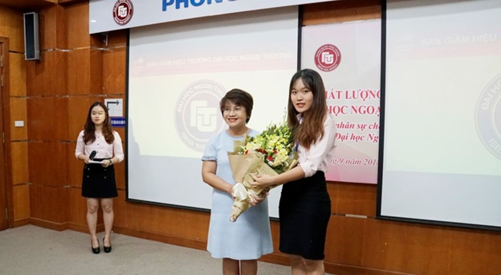 Chị Lê Thị Thuý Hà - Chủ tịch CLB Kế toán Kiểm toán viên tương lai trường Đại học Ngoại thương tặng hoa cho PGS, TS Nguyễn Thu Thuỷ – Phó hiệu trưởng trường Đại học Ngoại thương trong buổi họp báo