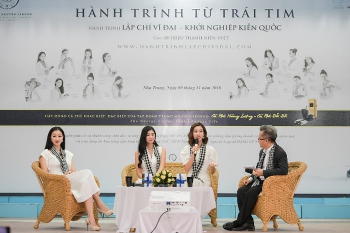 Hoa hậu Đỗ Mỹ Linh (thứ 2 từ phải qua) chia sẻ câu chuyện truyền cảm hứng trong chương trình Hành trình từ Trái Tim – Hành trình Lập chí Vĩ đại
