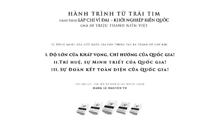 Hành trình Từ Trái Tim – Hành trình Lập Chí Vĩ Đại – Khởi Nghiệp Kiến Quốc cho 30 Triệu Thanh Niên Việt” do Tập đoàn Trung Nguyên Legend khởi xướng từ năm 2012 đến nay nhằm kiến tạo Khát vọng lớn, Chí cả vĩ đại cho thế hệ Thanh niên Việt Nam; xây dựng Trí huệ và sự Minh triết cho 30 triệu Thanh niên Việt thông qua việc trao tặng hàng chục triệu cuốn sách đổi đời tới Thanh niên Việt để có sức mạnh tri thức, từ đó chuyển hóa thành sức mạnh vật chất và thể chất, tạo nên sức mạnh của quốc gia.