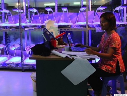 Bà Ngà làm việc cùng với các thiết bị của công ty mình.