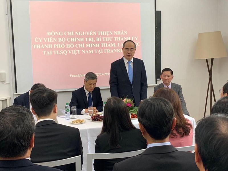 Tại cuộc làm việc với Lãnh sự quán Việt Nam tại Frankfurt, Bí thư Nguyễn Thiện Nhân cho biết chuyến thăm và làm việc lần này, TP.HCM muốn học hỏi, mở rộng cơ hội hợp tác với CHLB Đức nhiều lĩnh vực: Kinh tế số, đô thị thông minh, trung tâm tài chính, đào tạo nghề... Frankfurt là một trong những đối tác lớn, quan trọng.