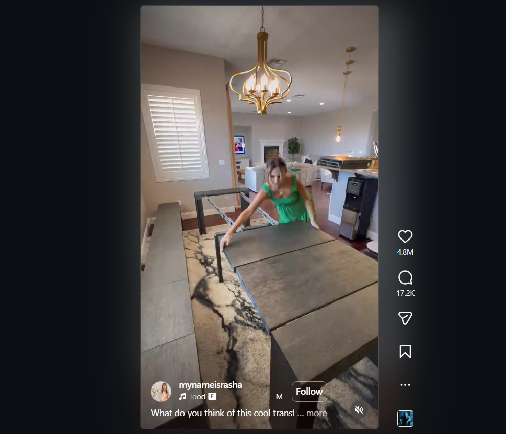 Video của Rasha là một minh họa đơn giản về cách mở rộng và thu gọn Bàn Biến Hình để phù hợp với số lượng khách khác nhau. Tuy nhiên, nó đã tạo ra bằng chứng xã hội về giá trị của sản phẩm và rất thành công trong việc giới thiệu chiếc bàn này đến một thị trường chưa được khai thác trước đây.