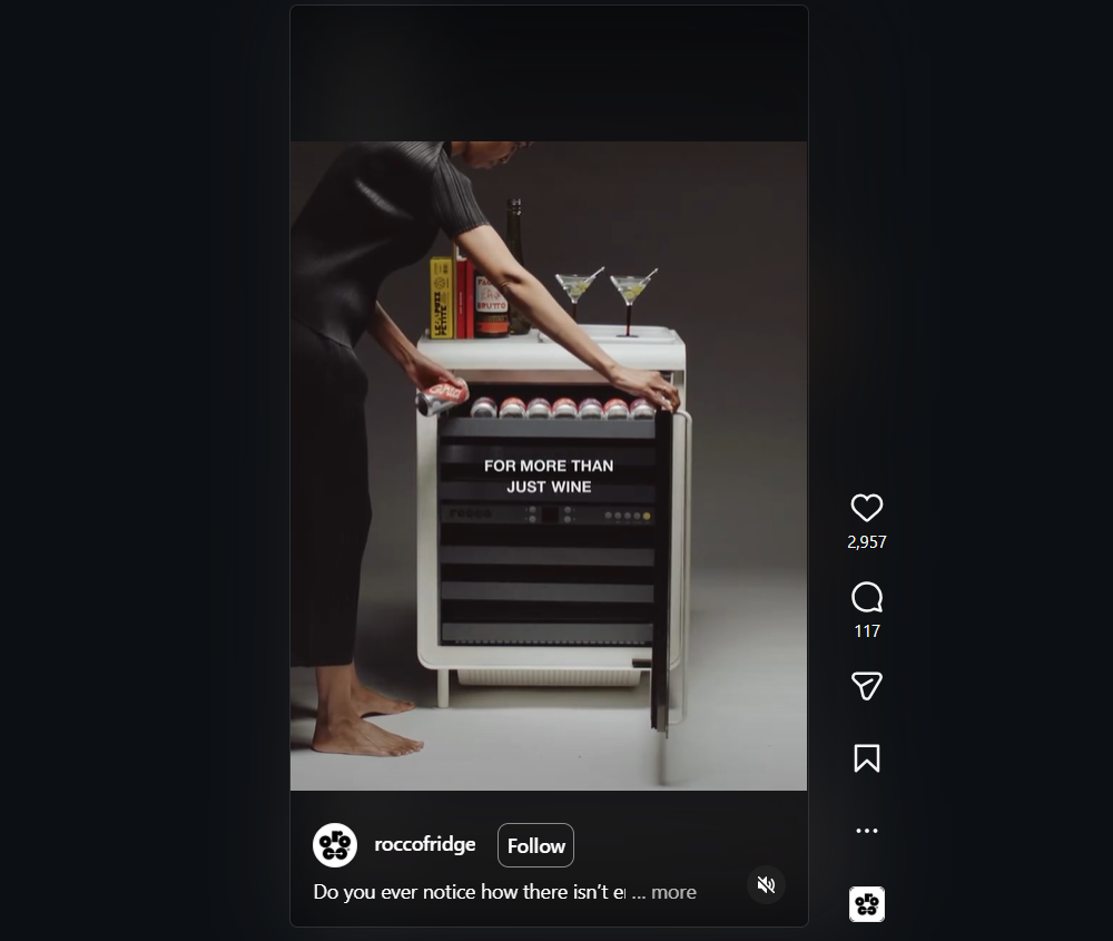 Việc trở nên nổi tiếng trên mạng thường là phần thưởng cho việc giới thiệu một góc nhìn mới về một sản phẩm đã quá quen thuộc. Đoạn video ngắn trên Instagram của Rocco , nhà sản xuất tủ lạnh thông minh, đã lan truyền mạnh mẽ trong thời gian ra mắt thương hiệu vào tháng 11 năm 2023. Nó thể hiện các giải pháp tiết kiệm không gian độc đáo và các tính năng thiết kế hiện đại của Rocco. Nó cũng phản ánh sứ mệnh của thương hiệu trong việc giải quyết nhu cầu thị trường về các loại tủ lạnh đựng đồ uống có tính thẩm mỹ cao. Bài đăng đã nhận được gần 200.000 lượt xem.